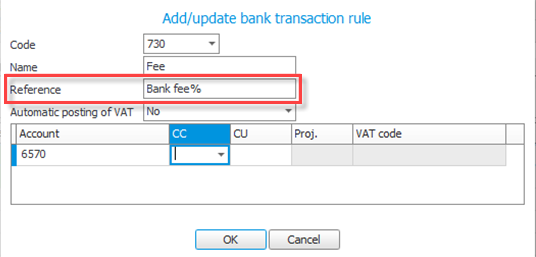 You can then enter a Reference for the bank transaction rule. If this reference appears on the transaction, the bank transaction rule will be used. You can also use a % as a wildcard character in the reference in order to match, e.g. by writing Bank charge%.