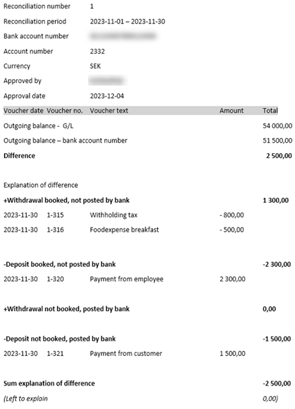 Under Settings mark for which period you want to reconcile the bank account. You can then approve and print your reconciliation report, which means that no changes can then be saved for the selected period. If you need to adjust anything, you can cancel the approved report. Approval and cancellation of bank reconciliation is done in the Approve/Print bank reconciliation procedure.
