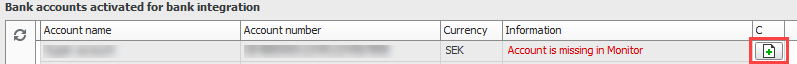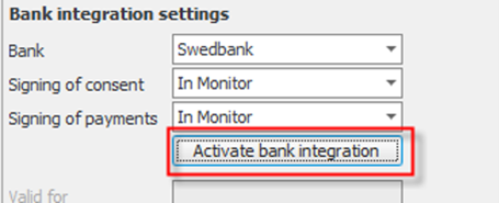 Bank integration is now activated for your user. Under Bank accounts activated for bank integration you can see which bank accounts a user has access to. If a bank account is missing in Monitor, you can create it by clicking the Create bank account button under the Bank integration tab.