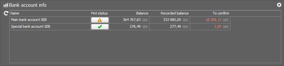 The Bank account info desktop component shows the balance of the bank accounts, the balance in the general ledger, and the balance of not confirmed payments. The bank account balance is loaded from the bank every night, but you can also load your current balance via the Update button