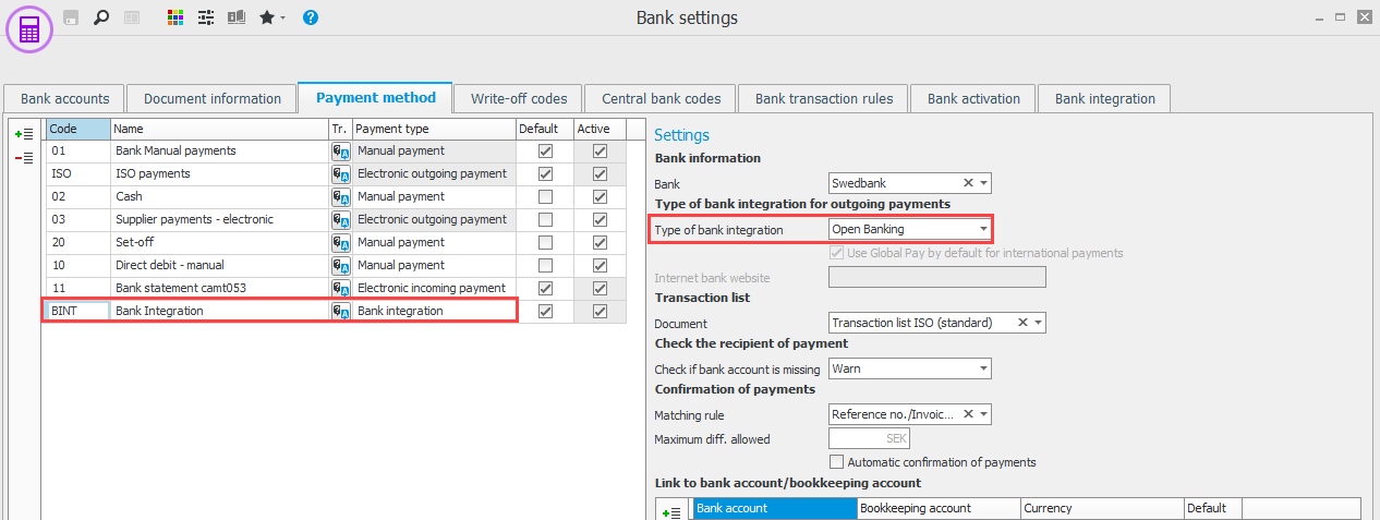 Under Settings you select your bank, and Open Banking as Type of bank integration. Open Banking uses Global Pay for international payments.