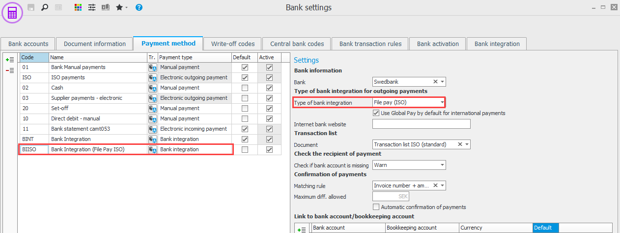 Under Settings you select your bank, and File pay (ISO) as Type of bank integration. The checkbox Use Global Pay by default for international payments is activated by default, but can be deactivated. You can also choose whether Global Pay should be used or not for each payment in payment suggestion.
