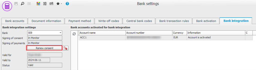 By signing, electronic consent is given that Bank integration can use the bank account for 180 days. After this, consent must be given again. A notification is displayed in Monitor ERP in advance letting you letting you know when the consent runs out.