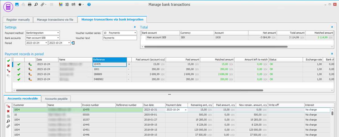 We recommend that you do not have the setting Automatic confirmation of payment activated the first time using Bank integration. This setting means that the system automatically matches and records payments. This occurs every night when bank statements are loaded from the bank.
