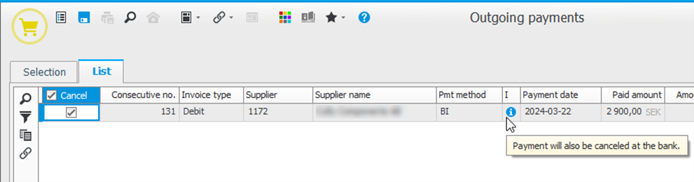 The exception is if you have made an outgoing payment via Open Banking and use the banks Nordea, SEB, or Swedbank. If this is the case, you are not able to cancel via online banking, but must cancel via Monitor ERP. When you save the cancellation in Monitor ERP, an automatic message is sent to the bank saying that the payment order has been canceled. Please note that it may take about a minute before the payment order has been removed in the internet bank.