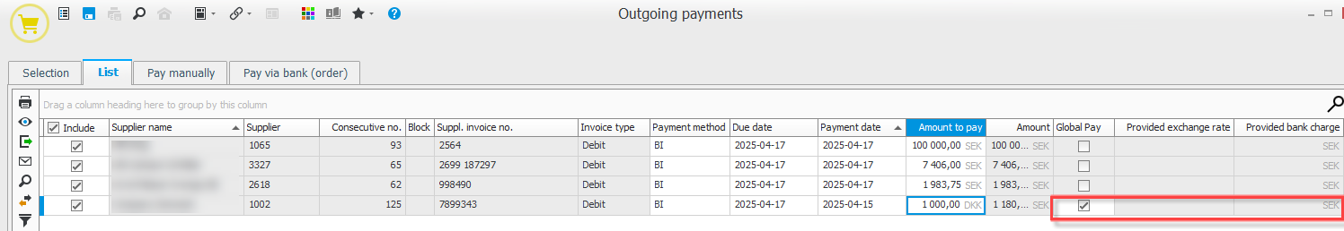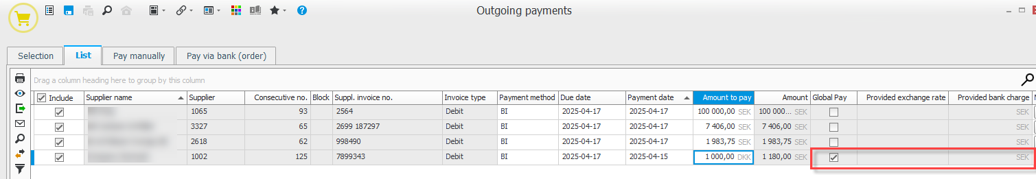 In other words, with Global Pay you can make payments in another currency from your account in your local currency (company currency). In the payment suggestion in the Outgoing payments procedure you can see which payments are made via Global Pay under the Global Pay column.