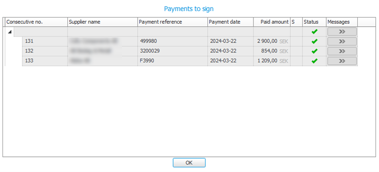 If the payment has a green tick under Status, it means that the payment has gone to the bank. If there is a yellow warning or a red cross in the Status column, it means that something has gone wrong and the payment has not gone to the bank. Under the Message button you can see what is stopping the payment from being sent to bank. For individual payments e.g. this can occur with OCR/reference number checks (read more in the section below). These payments need to be canceled and the issue must be resolved (e.g. enter OCR/Reference number on the supplier invoice) before sending the payment again.
