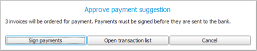 When you approve your payment suggestion, a question will appear asking if you wish to sign (approve) the selected payments. Signing of payments is done via online banking. If any payment files need countersigning, this is also done via online banking.
