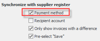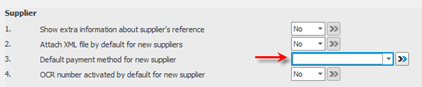 Make sure that you also adjust the system setting Default payment method for new supplier, so that new suppliers are by default registered with the payment method set for bank integration. You can find the setting under the Purchase tab in the System settings procedure.