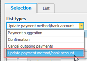 As before, outgoing payments are made via the Outgoing payments routine. Either directly via the Payment suggestion list type, or via the Pay via bank (order) tab. Use the payment method set for bank integration. Via the payment suggestion you can change the payment method of supplier invoices that are already registered. You are also able to update the payment method of all unpaid supplier invoices in the Update payment method/bank account list type in the same procedure.