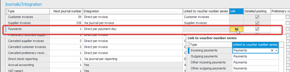 In Voucher number series/Journals you are able to link voucher number series to payment types for the integration Payments.