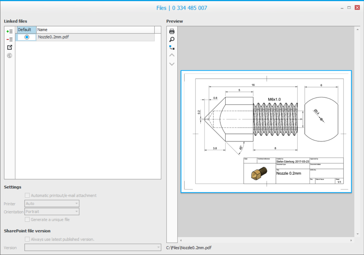 im Fenster öffnet die verknüpfte Datei im Programm, der der Dateityp in Windows zugeordnet ist. Wenn Sie eine Datei mit Datensätzen wie Angebote, Anfragen, Aufträge, Operationen und Material verknüpfen, können Sie den automatischen Ausdruck/E-Mail-Anhang aktivieren. Dies bedeutet, dass die verknüpfte Datei automatisch mit dem Hauptdokument gedruckt/angehängt wird.