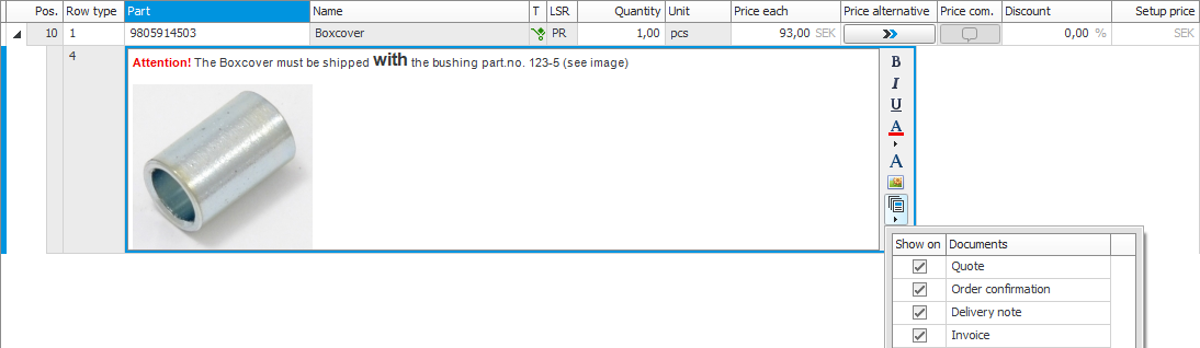 Der Texteditor ist auch für zusätzliche Textzeilen (Zeilentyp 4) bei Angeboten, Anfragen und Aufträgen verfügbar. Dort können Sie auswählen, auf welchen Dokumenttypen der zusätzliche Text angezeigt werden soll.