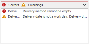 Das Validierungsfenster zeigt alle auftretenden Fehler oben und auftretende Warnungen am Ende an. Die Ursachen werden ebenfalls angezeigt. Wenn nicht genügend Platz für den vollständigen Ursachentext vorhanden ist, können Sie den Mauszeiger über den Fehler oder die Warnung setzen und der Text wird in einem Tooltipp angezeigt. Wenn Sie im Validierungsfenster auf einen Fehler oder eine Warnung doppelklicken, wird der Cursor in das betroffene Feld gesetzt. Sie können das Validierungsfenster mit der Schaltfläche minimieren
