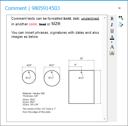 In Registrierungs- und Meldeverfahren können Sie verschiedene Arten von Kommentaren, Anweisungen, zusätzlichen Texten usw. für geladene Datensätze eingeben. Dann finden Sie einen kleinen Texteditor mit Funktionen zur Textformatierung. Neben dem Schreiben von Text können Sie auch Bilder, Phrasen (aus einem Phrasenregister) und Ihre Unterschrift (bestehend aus dem heutigen Datum und Ihrem Benutzernamen) einfügen. Sie können das Text-Editor-Fenster auch lösen, indem Sie die Schaltfläche