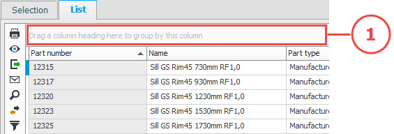 Am oberen Rand aller Listen befindet sich ein interaktiver Gruppierungskopf (1). Um die Liste zu gruppieren, ziehen Sie mit dem Mauszeiger eine Spaltenüberschrift aus der Liste und legen sie in der Gruppierungsüberschrift ab. Sie können in mehreren Ebenen gruppieren, indem Sie mehrere Spaltenüberschriften in die Gruppierungsüberschrift ziehen. Umgekehrt können Sie eine Gruppierung auch entfernen, indem Sie eine Spaltenüberschrift aus der Gruppierungsüberschrift ziehen und zwischen zwei anderen Spaltenüberschriften in der Liste ablegen. Dann wird diese Spalte zurück in die Liste verschoben.