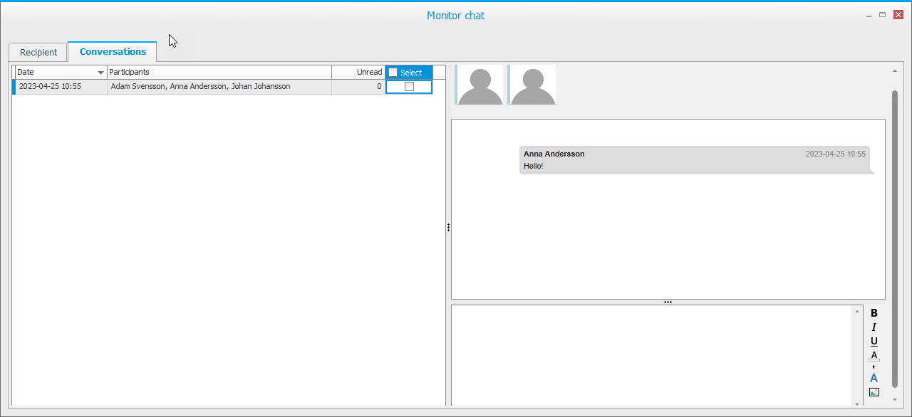 Das Chat-Fenster auf der Registerkarte Unterhaltungen funktioniert auf die gleiche Weise wie beispielsweise Teams. Sie sehen die gesendeten und empfangenen Nachrichten, und es gibt einen kleinen Texteditor, in dem Sie Texte eingeben und formatieren und Hyperlinks aus Monitor- oder Bilddateien einfügen können. Sie senden Nachrichten an die Personen im Chat, indem Sie die Eingabetaste drücken. Wenn in dem Personalstamm für die betreffenden Personen ein Bild/Foto hinzugefügt wurde, wird dieses Bild hier angezeigt.