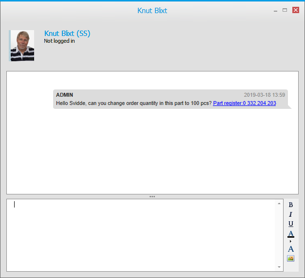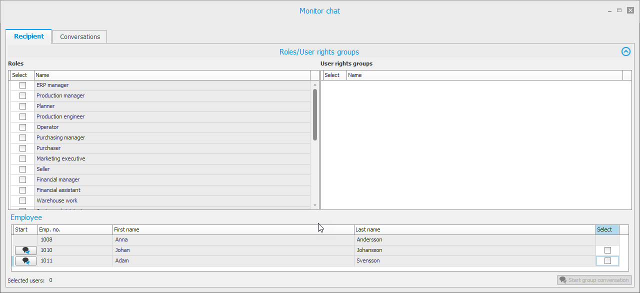 Im Monitor-Chat gibt es eine Registerkarte, in der Sie auswählen, mit welchen Personen Sie chatten möchten. Unter einer anderen Registerkarte können Sie gespeicherte Unterhaltungen sehen. Hier können Sie auch auswählen, ob Sie sie als bereits gelesen markieren, ausblenden oder die Konversation neu starten möchten. Das Chat-Fenster ähnelt anderen Programmen für Instant Messaging, z. B. Teams. Die Chat-Funktion in Monitor ERP kann auch verwendet werden, um Bilddateien zu senden und Hyperlinks zwischen Ihnen und anderen Personen im Unternehmen zu überwachen.