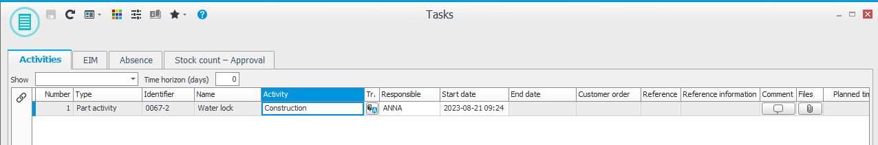 Unter der Registerkarte Aktivitäten können Sie die meisten Informationen zu einer Aktivität ändern, mit Ausnahme von Nummer, Typ und Kennung. Es ist auch möglich, Aktivitäten zu beenden. Für Projektaktivitäten und Fallaktivitäten sehen Sie geplante Start- und Enddaten. Für andere Aktivitäten (z. B. Aktivitäten im Kunden-, Lieferanten- und Teile-Registerverfahren) wird das geplante Datum für die Aktivität in der Spalte Startdatum angezeigt. Sie können abgeschlossene Aktivitäten und Projektaktivitäten anzeigen, die nicht startbereit sind. Die Option Projektaktivitäten nicht startbereit gilt nur für Projektaktivitäten mit Abhängigkeiten. Mit der Einstellung Zeithorizont (Tage) können Sie auswählen, wie viele Tage im Voraus Sie Aktivitäten sehen möchten. Wenn Sie eine Aktivität als abgeschlossen speichern, wird ein Texteditor in einem Fenster geöffnet. Dort können Sie ein Thema eingeben und einen Text zur ausgeführten Aktivität schreiben. Sie können auch Dateien mit der durchgeführten Aktivität verknüpfen.