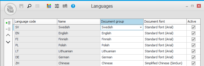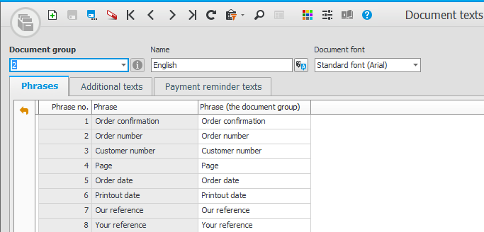 In der Dokumenttexte Prozedur ist es auch möglich, Phrasen zu übersetzen. Diese Ausdrücke sind in der Dokumentgruppe vorhanden, die Sie in der Prozedur registrieren und dann in der Prozedur Sprachen mit einer Sprache verbinden. Die Phrasen sind die Überschriften (Leittexte), die auf allen gedruckten Dokumenten vorkommen. Bei der Installation des Systems werden Dokumentengruppen mit fertigen Phrasenübersetzungen für die Sprachen einbezogen, die Sie unter Sprache in Backstage in findenMonitor ERP.