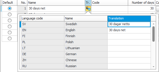 In der Übersetzungstabelle können Sie die Felder verwenden, um eine Übersetzung für jede Sprache des betreffenden Textes einzugeben. Für die Firmensprache wird die Übersetzung ein alternativer Text sein. Im Beispiel ist die Firmensprache Schwedisch. Die Übersetzung für eine bestimmte Sprache wird für externe Dokumente (z. B. Bestellungen, Auftragsbestätigungen, Rechnungen) angezeigt und wird durch die für die Adresse des Dokuments ausgewählte Sprache bestimmt.