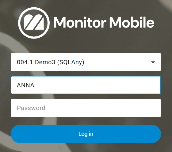 Sie erhalten die Adresse von Ihrem Administrator an den Webserver. Wenn Sie die Adresse im Webbrowser eingegeben haben, wird eine Anmeldeseite angezeigt. Dort geben Sie Ihren Benutzernamen Monitor ERP und das von Ihrem Administrator angegebene Passwort ein. Alternativ ist es das gleiche Passwort, das Sie für Ihr Windows-Konto verwenden.