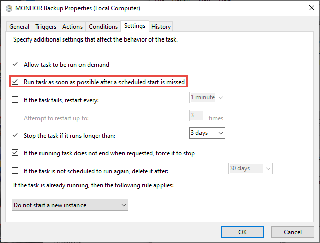Aktivieren Sie die Einstellung Task ausführen so schnell wie möglich, nachdem ein geplanter Start verpasst wurde. Klicken Sie dann auf OK.