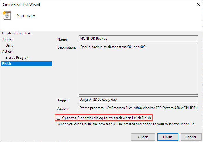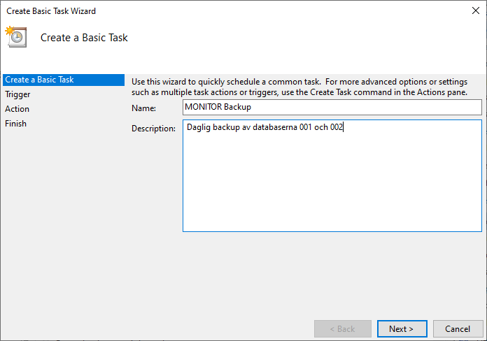 Dies ist eine Methode zum manuellen Erstellen und Planen von Sicherungsaufgaben auf dem Monitor-Server. Es gibt auch eine alternative Methode zum Erstellen und Planen von Sicherungsaufgaben mit Monitor ERP Installation Manager auf dem Monitor-Server. Siehe unten.