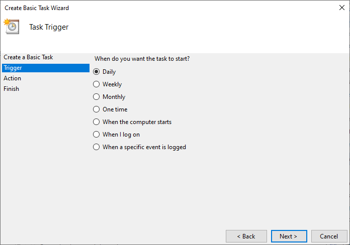 Wählen Sie aus, wann die Aktivität ausgeführt werden soll. Täglich ist die voreingestellte und empfohlene Option für die Sicherung von Datenbanken. Für das Kopieren in die Testfirma wählen Sie eine der Optionen, wie oft Sie in die Testfirma kopieren möchten. Klicken Sie auf Weiter >.