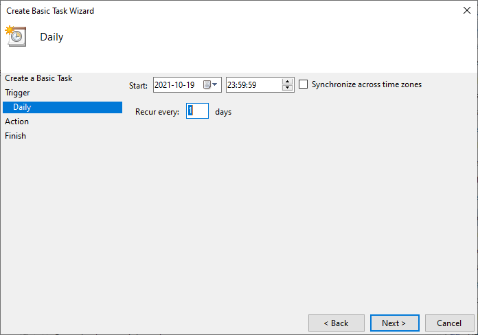 In Start wählen Sie Datum und Uhrzeit aus, zu der die Aktivität beginnen soll. Im Feld Recur every geben Sie ein, wie oft die Aktivität wiederholt werden soll. Es wird empfohlen, die Aktivität jeden Tag auszuführen, wenn es um die Sicherung geht. Wenn es um das Kopieren zum Testunternehmen geht, können Sie ein beliebiges Intervall eingeben. Klicken Sie auf Weiter >.