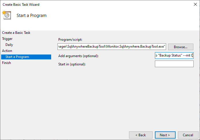 - In Fällen, in denen die Sicherungsaufgabe im Installation Manager auf dem Monitor-Server eingerichtet ist, um über das Netzwerk zum Datenbankserver ausgeführt zu werden, müssen Sie die UNC-Dateipfade durch lokale Dateipfade in der Sicherungsaufgabe ersetzen. Dies geschieht im Feld Argumente hinzufügen (siehe Punkt 9 oben unter der Überschrift Backup manuell mit Task Scheduler in Windows erstellen und planen).