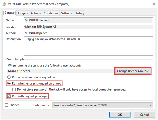 Klicken Sie im sich öffnenden Dialogfeld auf die Schaltfläche Benutzer oder Gruppe ändern... und geben Sie das Windows-Konto ein, das die Aktivität ausführen soll. Es ist normalerweise das gleiche Konto, das den Dienst für den Monitor-Server oder ein Administrationskonto ausführt. Aktivieren Sie auch die Einstellungen Ausführen, unabhängig davon, ob der Benutzer angemeldet ist oder nicht, und Ausführen mit den höchsten Berechtigungen. Klicken Sie auf die Registerkarte Einstellungen.