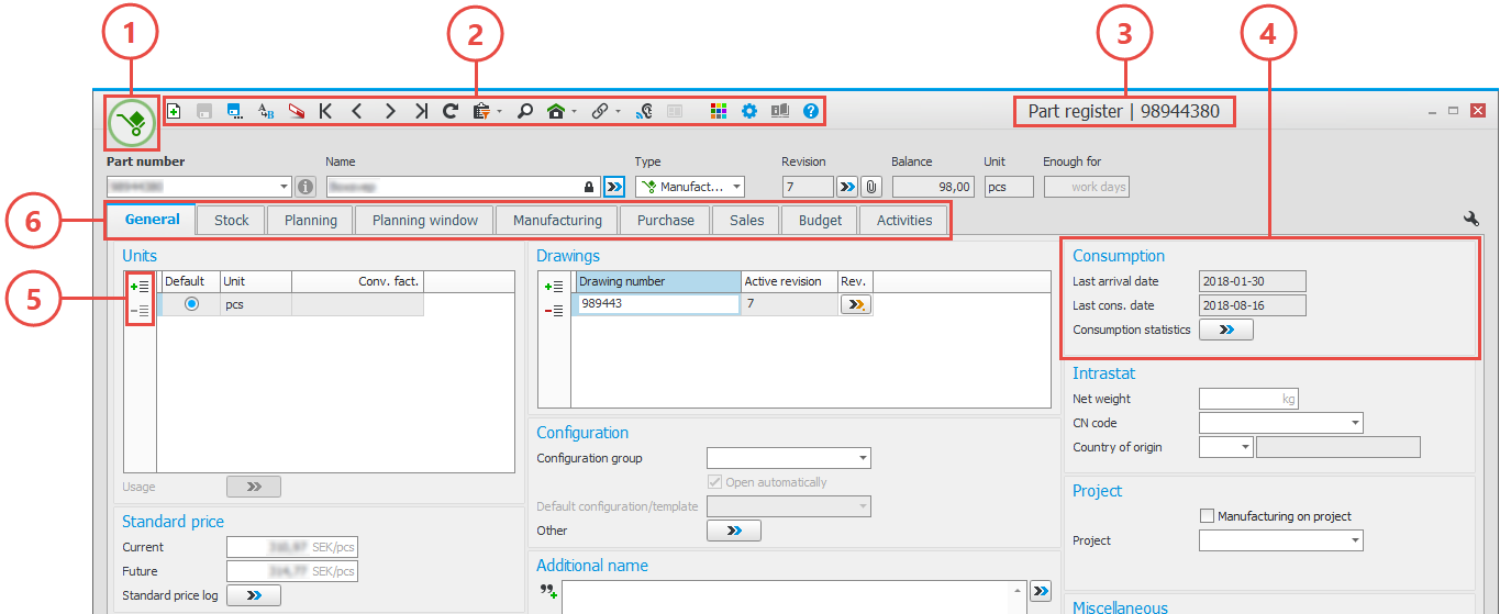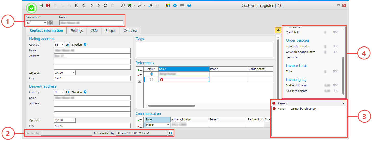 Single-Record-Verfahren werden verwendet, um jeweils einen Datensatz zu registrieren und zu aktualisieren. Dies sind Datensätze, die viele Informationen enthalten, z. B. Teile, Kunden und Kundenaufträge. Das Verfahrensfenster enthält auch die folgenden Abschnitte: Kopfzeile (1) mit Datensatzauswahl, Statuszeile (2) mit Informationen darüber, wann der Datensatz zuletzt geändert und gedruckt wurde, Validierungsfenster (3) mit Warnungen und Fehlern, falls vorhanden, aus verschiedenen Validierungen im Verfahren und das Seitenfenster (4) mit nützlichen Informationen aus verschiedenen Registern, die mit dem betreffenden Datensatz verknüpft sind.