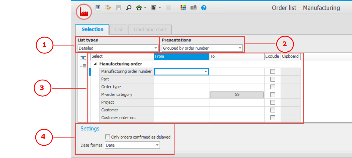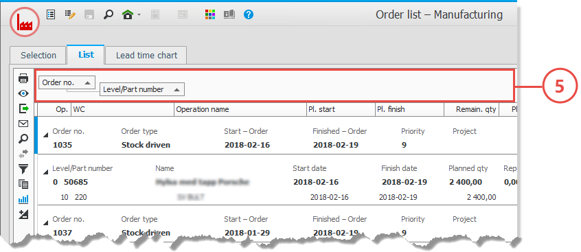 Listenverfahren werden verwendet, um mehrere Datensätze auszuwählen und in verschiedene Listen für den Druck und das Reporting zu laden. Die Verfahrensfenster enthalten die folgenden Abschnitte: Listentypen (1), Präsentationen (2), Auswahlzeilen (3), Einstellungen (4). Eine Liste wird in der Registerkarte Liste angezeigt, die eine Gruppierungsüberschrift (5) aufweist. Einige Listen haben auch eine Seitenleiste.