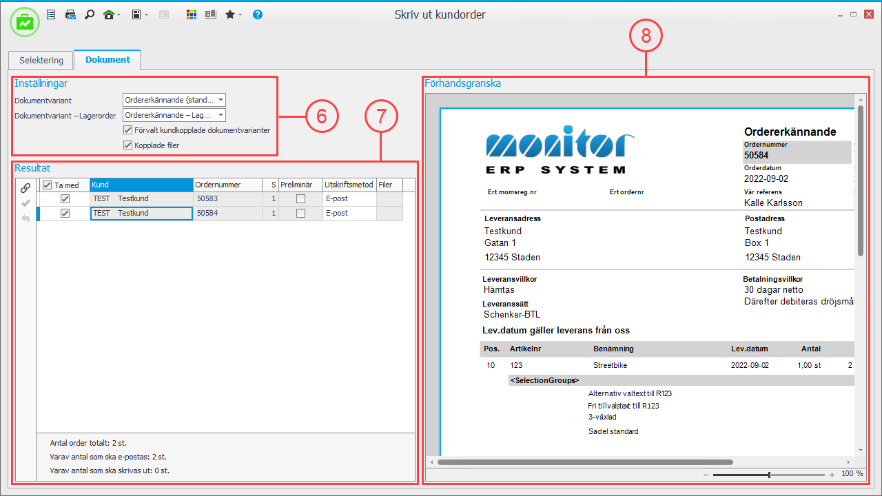 Ausdruckprozeduren sind eine Art Listenprozedur. Das Verfahrensfenster enthält die gleichen Teile – Listenarten (1), Auswahlzeilen (3) und Einstellungen (4) – wie die Registerkarte Auswahl, wie oben gezeigt. Druckverfahren haben keine Registerkarte mit der Bezeichnung Liste oder eine Seitenleiste. Stattdessen haben sie die Registerkarte Dokumente, die Folgendes enthält: Einstellungen (6), Ergebnis (7) und Vorschau (8).