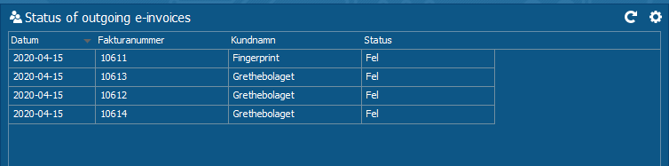 The Status of outgoing e-invoices desktop component provides an overview as well as the status of invoices sent. The component communicates with the operator’s server. For example, you can enter the number of days back in time to be shown.