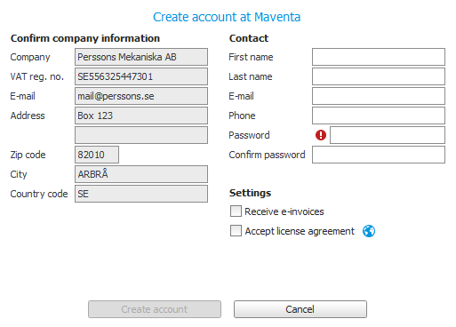 button. - Click Create account. When you create the account, Monitor ERP has contact with Maventa via an API in order to complete the registration. If everything works correctly, you will automatically receive your company's API keys and EID.