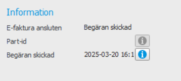 När en begäran skickats visas Begäran skickad bredvid E-faktura ansluten under Information längst ner till vänster i fönstret. Du ser även vilket datum som begäran skickades.