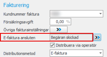 När du stänger dialogen för Crediflow, ser du även under Fakturering att status i fältet bredvid E-faktura ansluten ändrats till Begäran skickad.