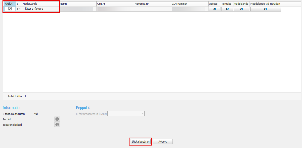 Om kunden tillåter e-faktura innebär det att kunden kan ta emot e-fakturor men att de först vill godkänna avsändaren innan de går att skicka e-faktura till dem. I detta fall skickar du ett meddelande med en begäran till kunden, kunden behöver sedan godkänna din begäran innan du kan börja skicka e-faktura till dem. För att skicka en begäran markerar du kryssrutan under kolumnen Anslut och sedan använder du knappen Skicka begäran längst ner i fönstret.