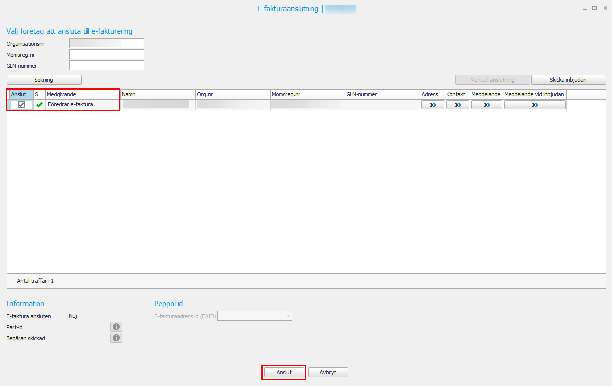 Efter några minuter, när kunden registrerats och verifierats i Crediflows mottagarregister, utför du en e-fakturasökning på kunden med hjälp av kundens momsregistreringsnummer. Medgivande för kunden ska nu vara Föredrar e-faktura och det ska därmed vara möjligt att ansluta kunden. Du ansluter till kunden genom att markera kryssrutan Anslut och sedan på knappen Anslut.