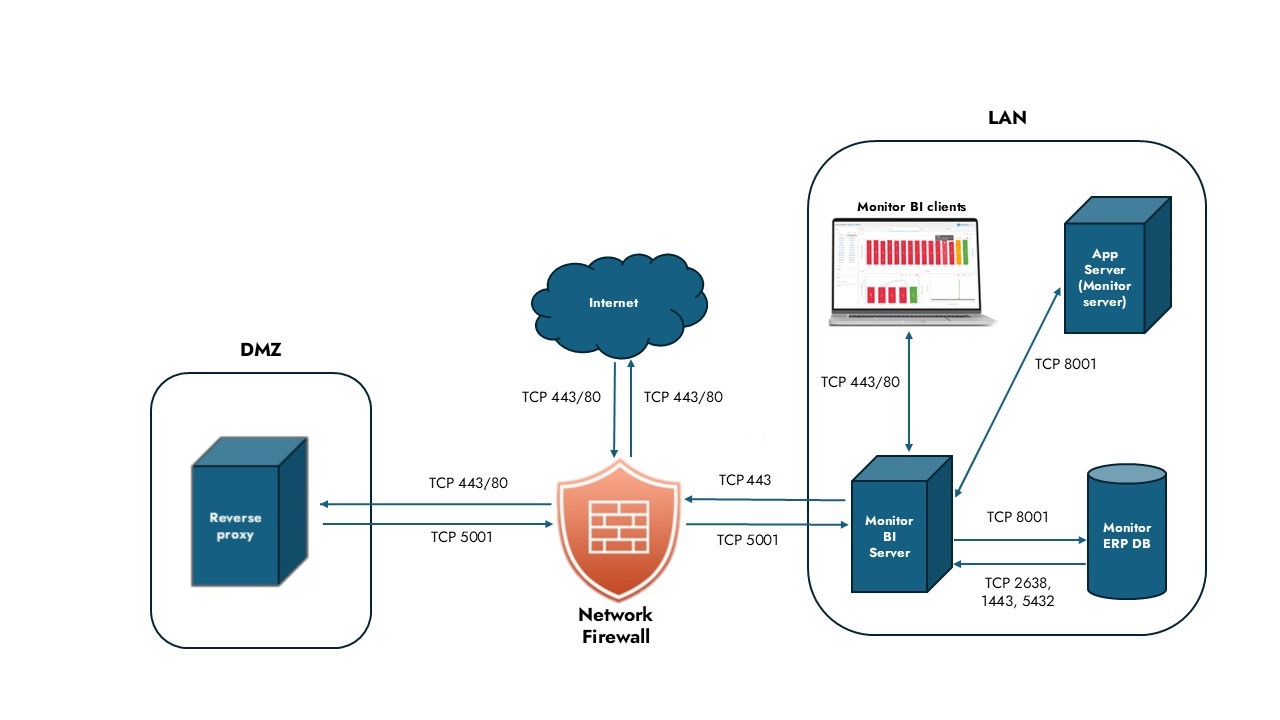 | TCP | 8001 | DMZ → LAN | Used by the BI server server for communication with the application server (the Monitor server). |