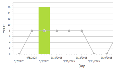 In the example below, Tuesday the 9th is overloaded. The loading is 16 hours, but the capacity is 8 hours.