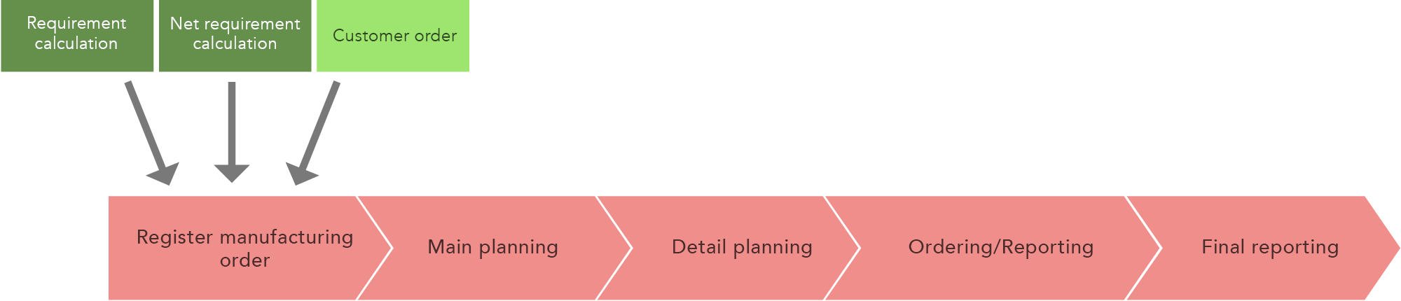 This description shows the manufacturing order flow in the Manufacturing module, as well as the registers used and how an order is transferred from one register to another. Under each section, the different procedures are described in detail.