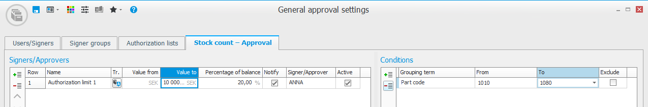 You can also configure part conditions for the signer/approver. You can set intervals either for part number, part code, product group or ABC