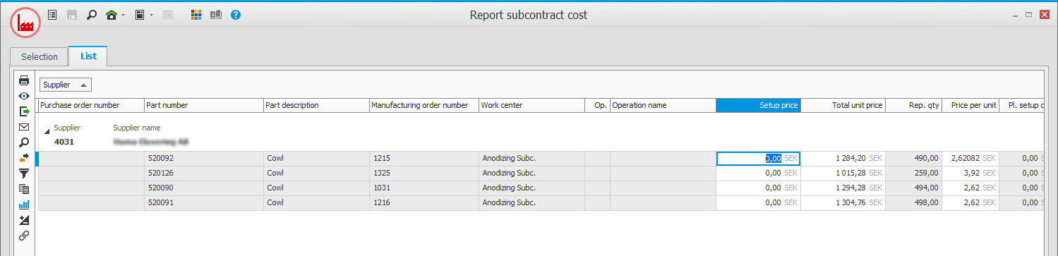 You can report or adjust actual costs for subcontracts on manufacturing orders after you have received the supplier invoices. For example, when the invoice does not specify the setup cost and the unit cost in detail. Then you use the Report subcontract cost procedure. In that procedure you can load a list where you can update Setup price, Total unit price, or Price per unit.