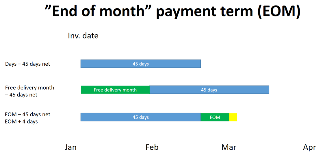 - End of month – This method resembles the Free delivery month method, but the difference is that the credit time (for example, 45 days) is counted directly from the invoice date, and then the remaining time of the month will be added to when the due date occurs. An example of EOM: The due date is firstly calculated 30 days ahead – for example, June 10 for an invoice sent on May 11. It is then extended to the end of the month (in this example, June 30).