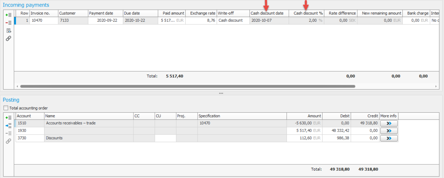 When registering payments, the system checks if there is a cash discount on the invoice. If the entered payment date is the same date as the cash discount date, or earlier, then the discounted amount will be suggested in the field Paid amount, but it can be adjusted. Please note! The days of grace for cash discount which you entered in the system settings, will also be taken into consideration. When cash discount is given, the remaining amount will be set to zero and the system will automatically suggest the write-off code Cash discount. If you are using cash discounts you should add the columns Cash discount date and Cash discount % from More info (see image).