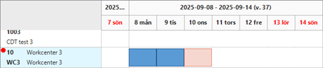 In the example below, a longer operation is shown. For the work center WC2 in the example, 2 additional days have been entered. This means the operation can be distributed to Monday and Tuesday (two days that are not consecutive to the finish date on Thursday).