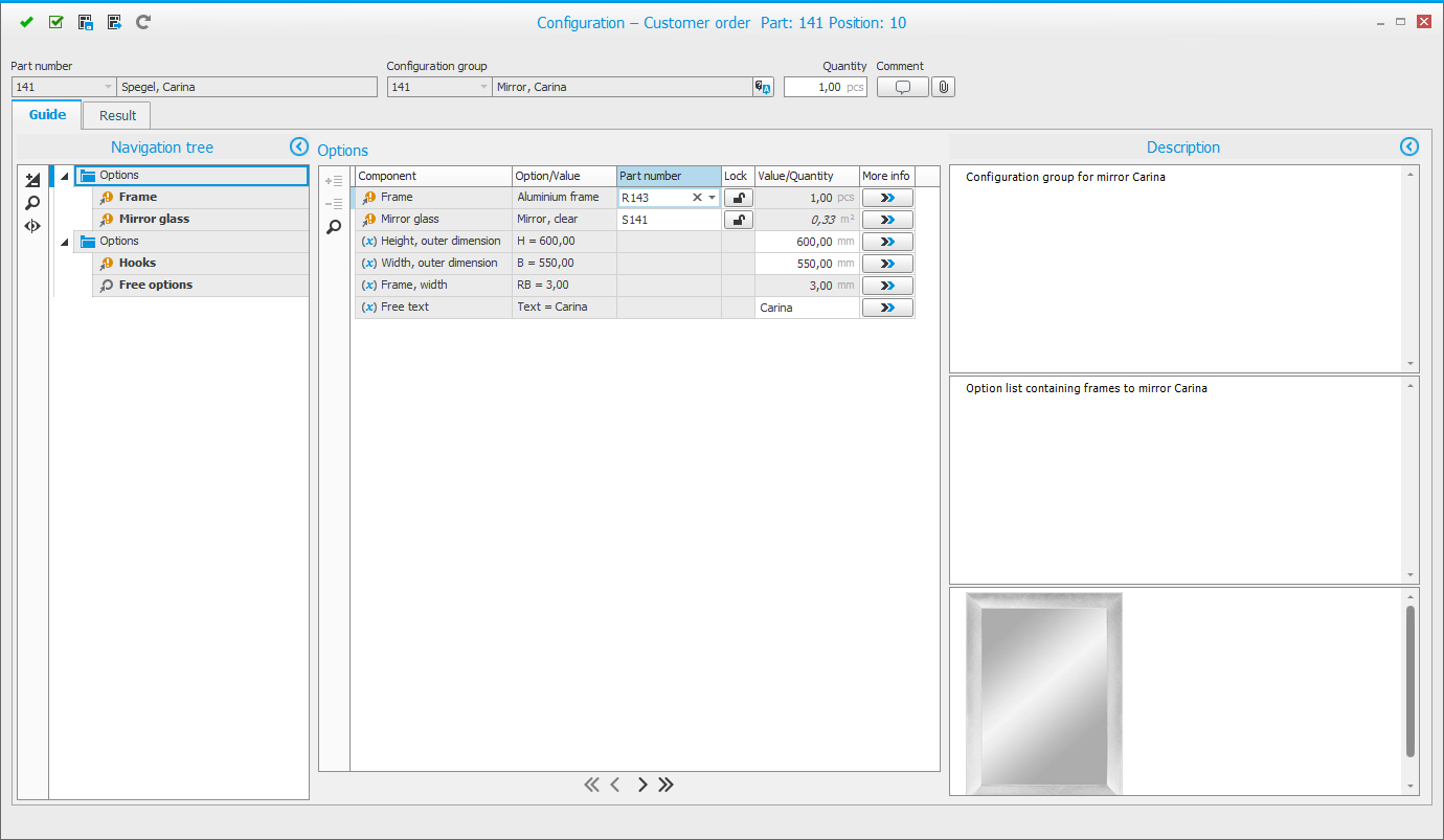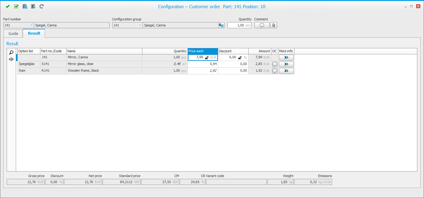 When a configuration is confirmed, the total net price is saved to the price each on the order row. The weight on each component in the configuration is shown in total and becomes saved to the order row. A pre-calculation is then also made and the result from that calculation will be saved to the standard price on the order row.
